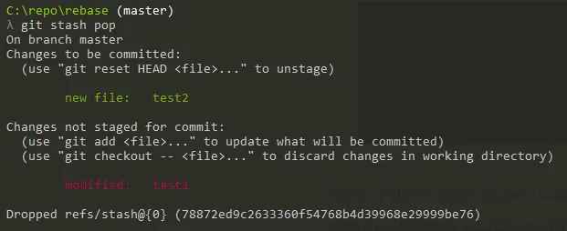 Now, if there were some changes in origin/master I could just call git pull and don’t worry about my unsaved work getting in a way of fast-forwarding to the recent repository’s state. Applying stashed changes is as easy as calling git stash pop.